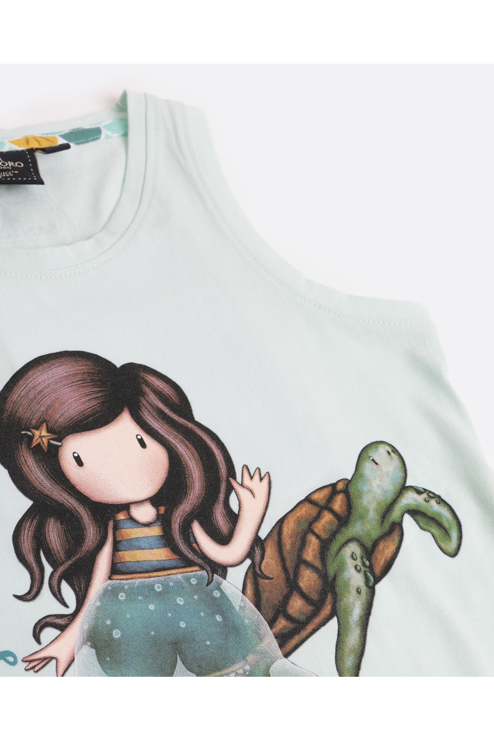 * Camiseta de punto liso, de color aqua, con dibujo frontal estampado, personalizada de la marca Santoro Gorjuss.