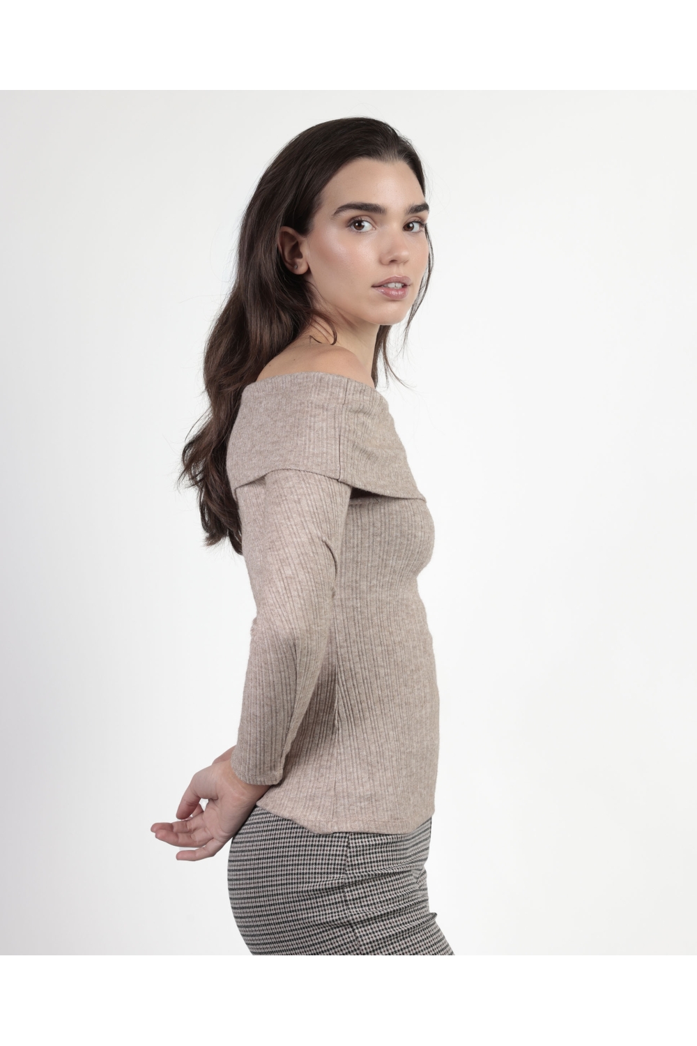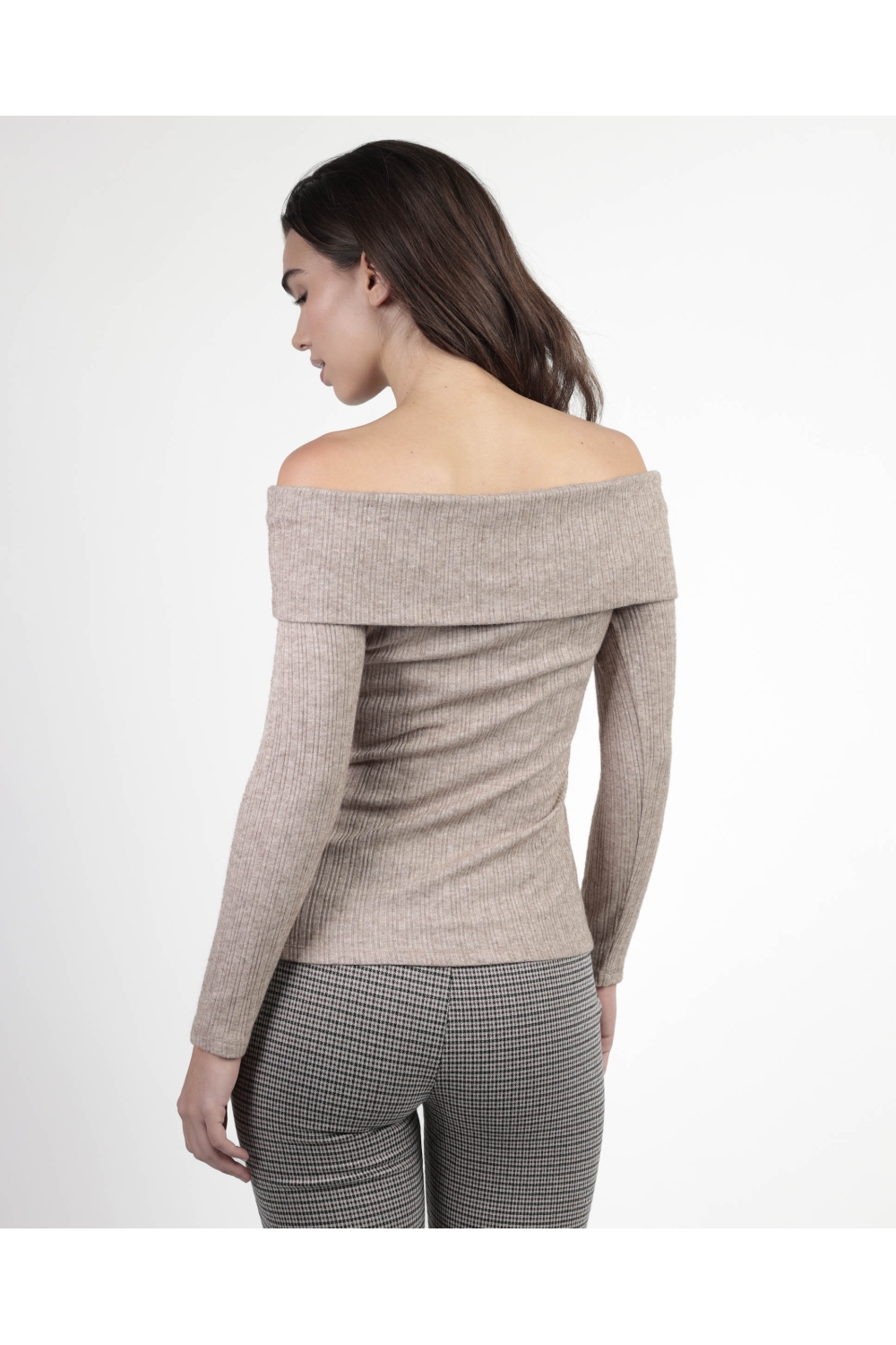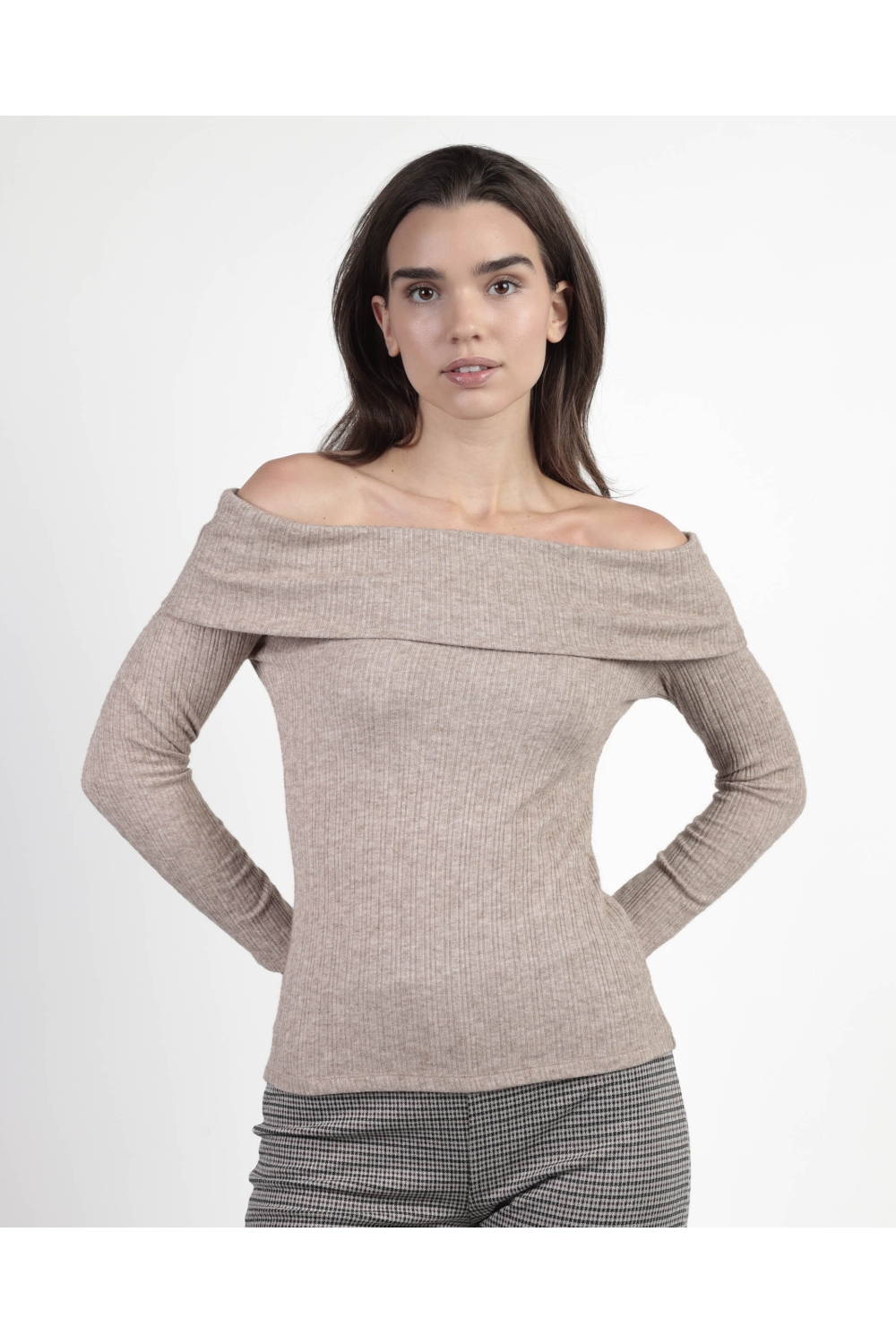 * Camiseta para mujer, de manga larga, con escote con hombros descubiertos y con estructura de canalé, disponible en dos combinaciones de color: beige jaspe y gris jaspe.