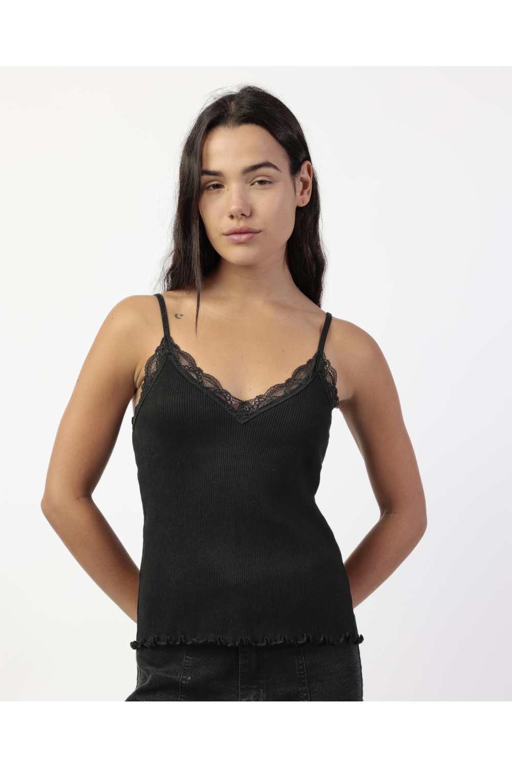 * Camiseta para mujer, de tirantes y escote pico, con estructura de canalé, disponible en dos combinaciones de color: visón y negro.
