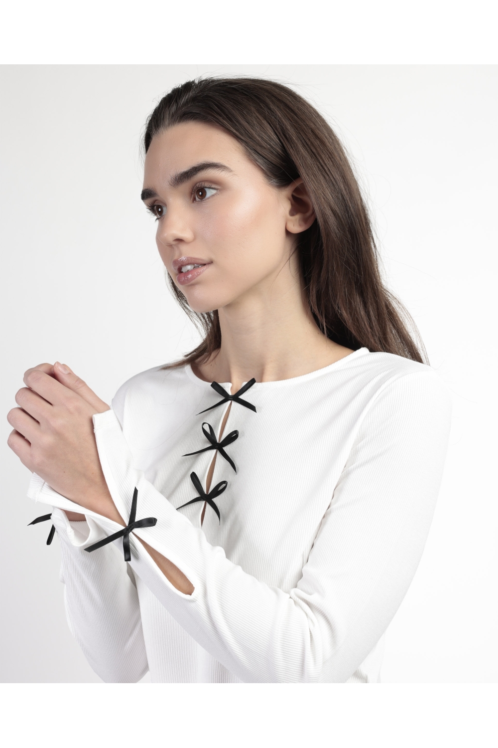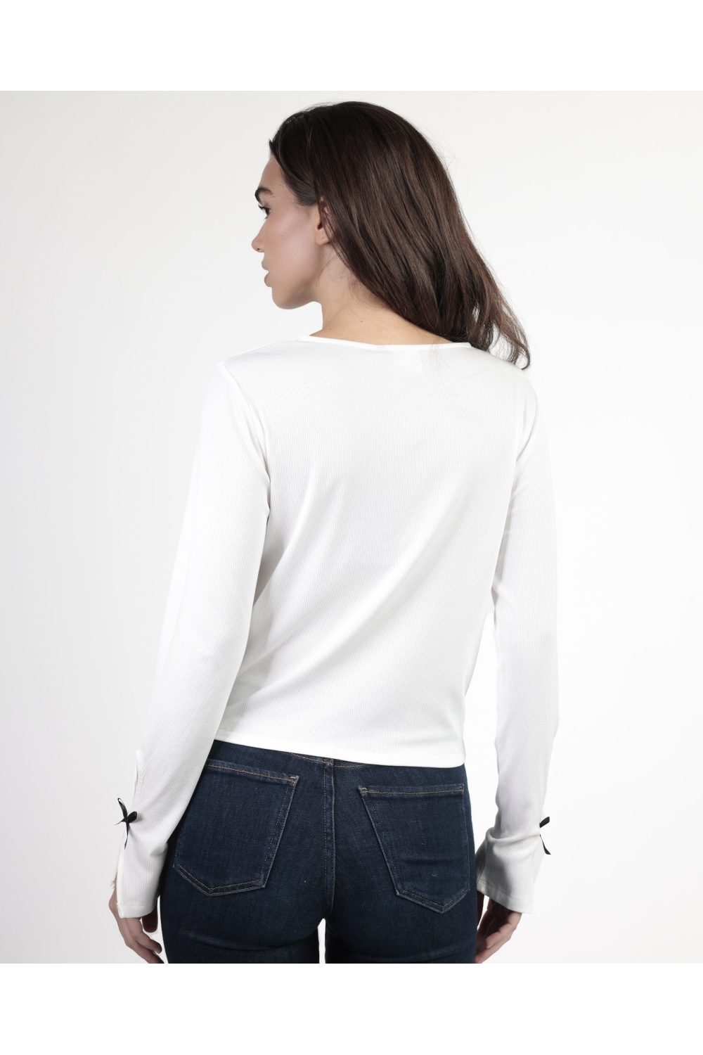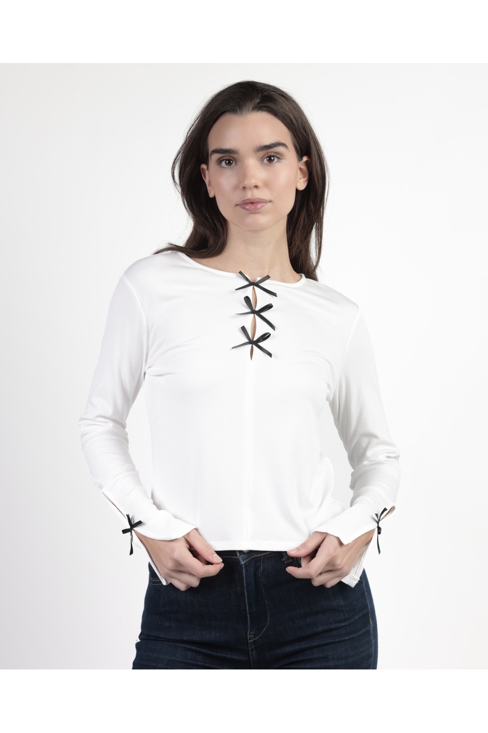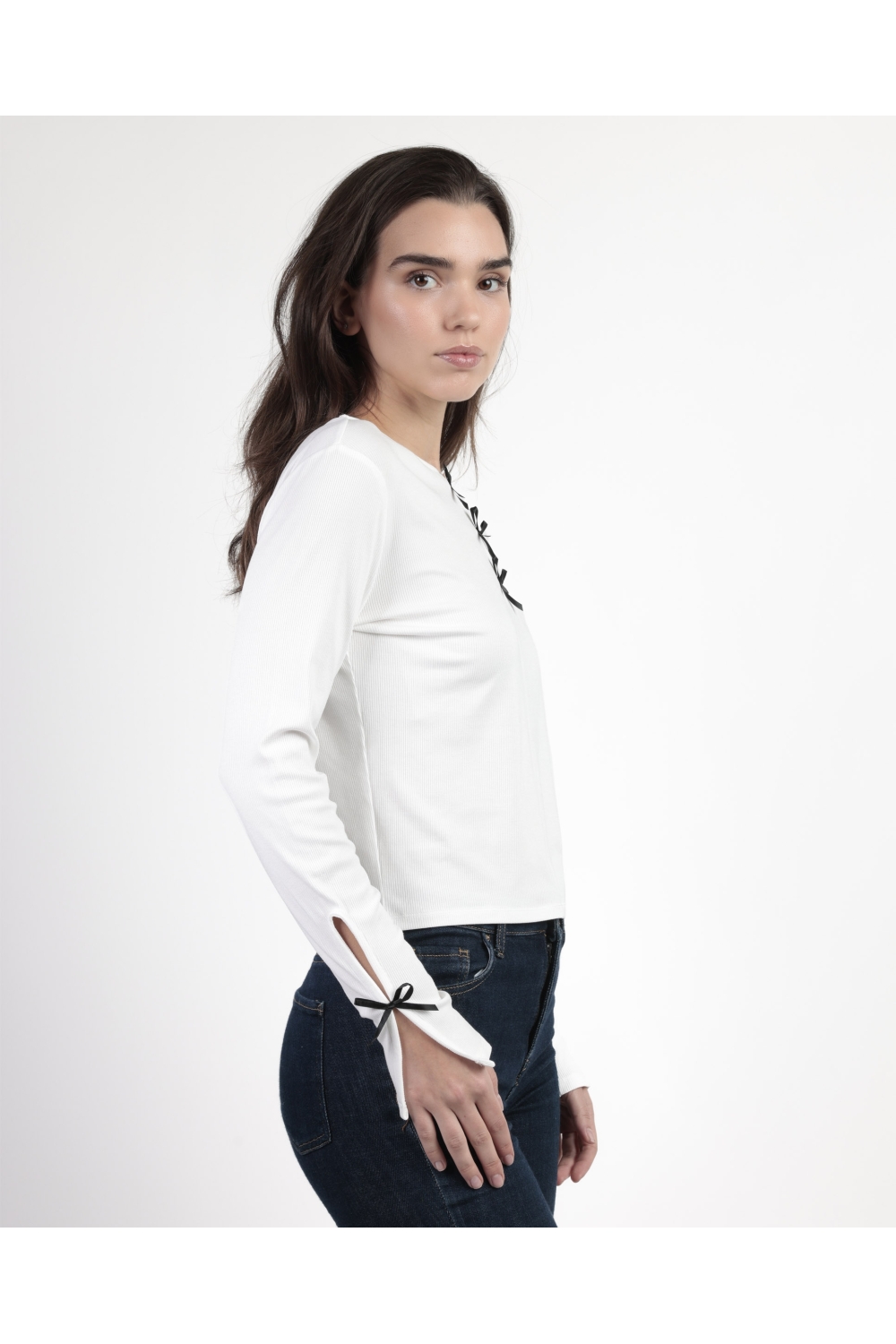 * Camiseta para mujer, de manga larga y cuello redondo con detalles de lacitos.