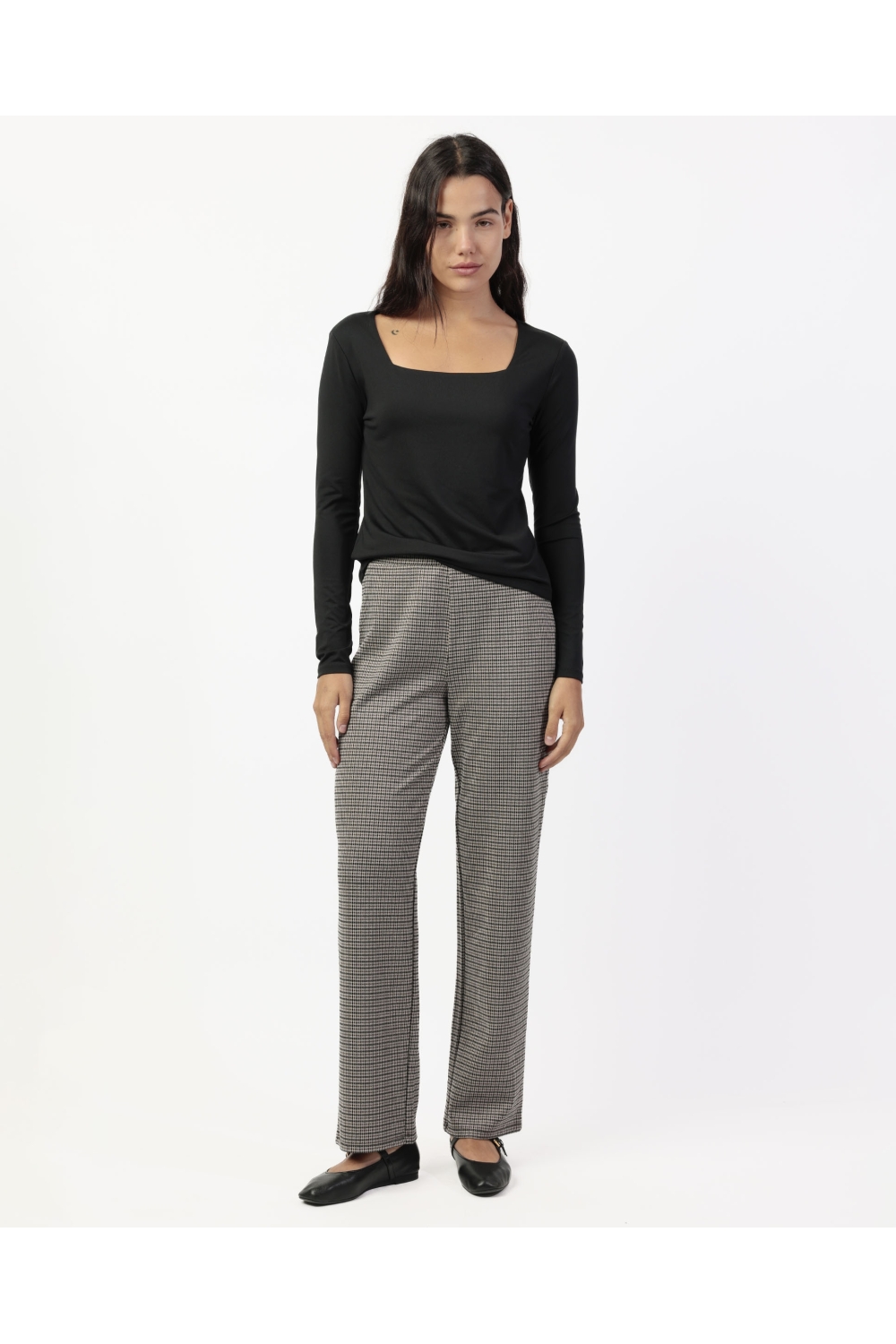 * Pantalón largo, de punto elástico estampado de cuadros, disponible en color beige.