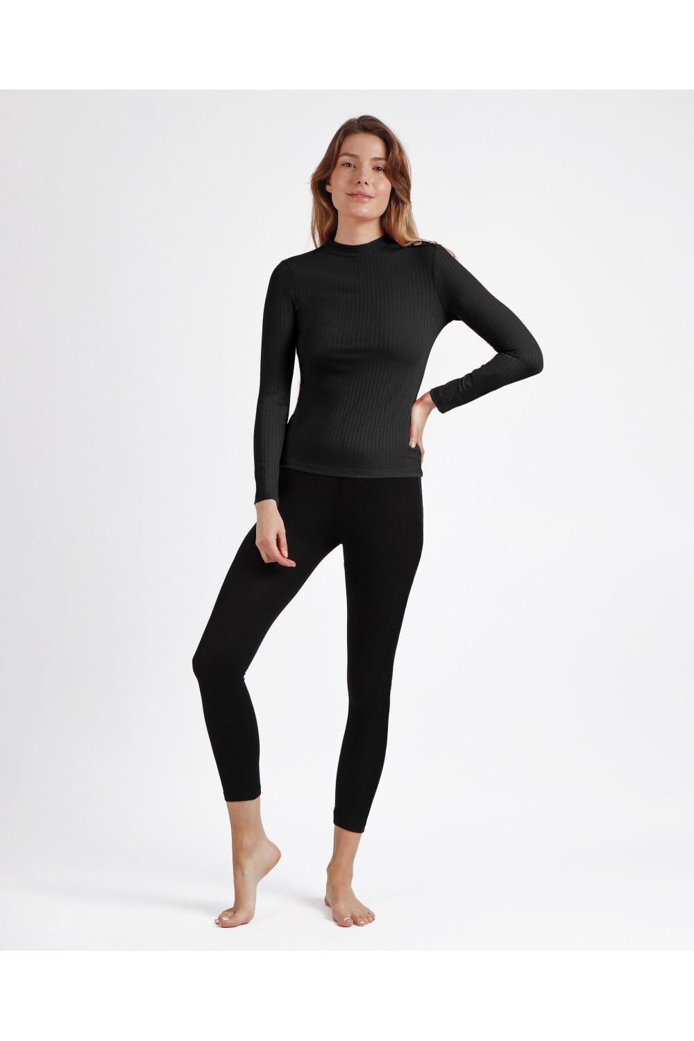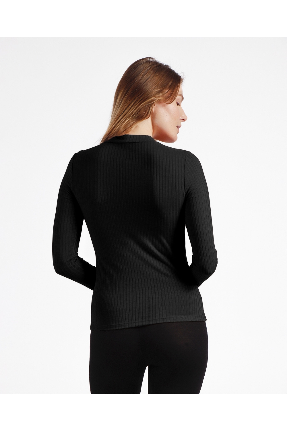 * Camiseta canalé, de punto, de manga larga, con cuello perkins, en tres combinaciones de color: negro, caldera y verde.