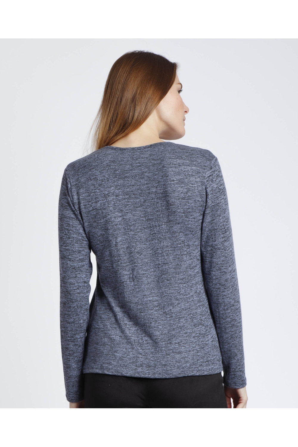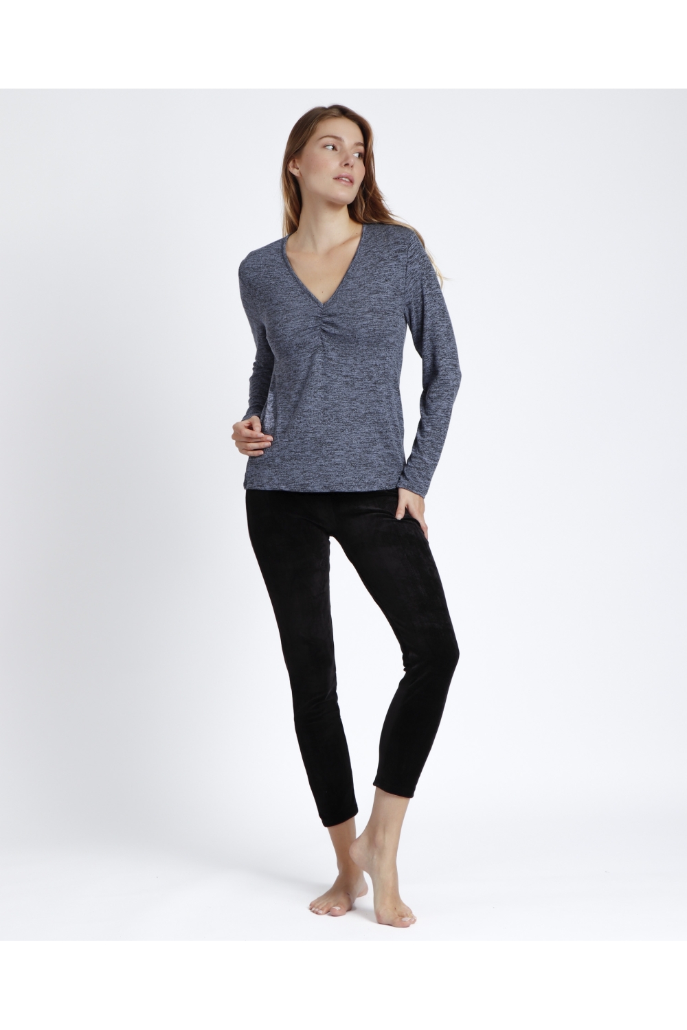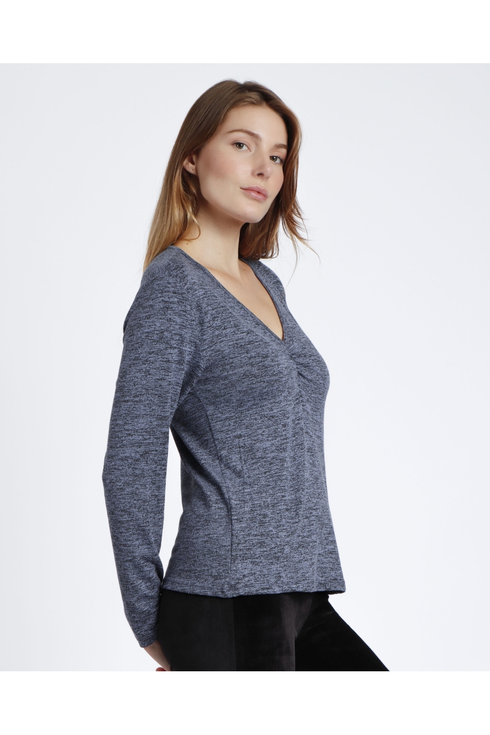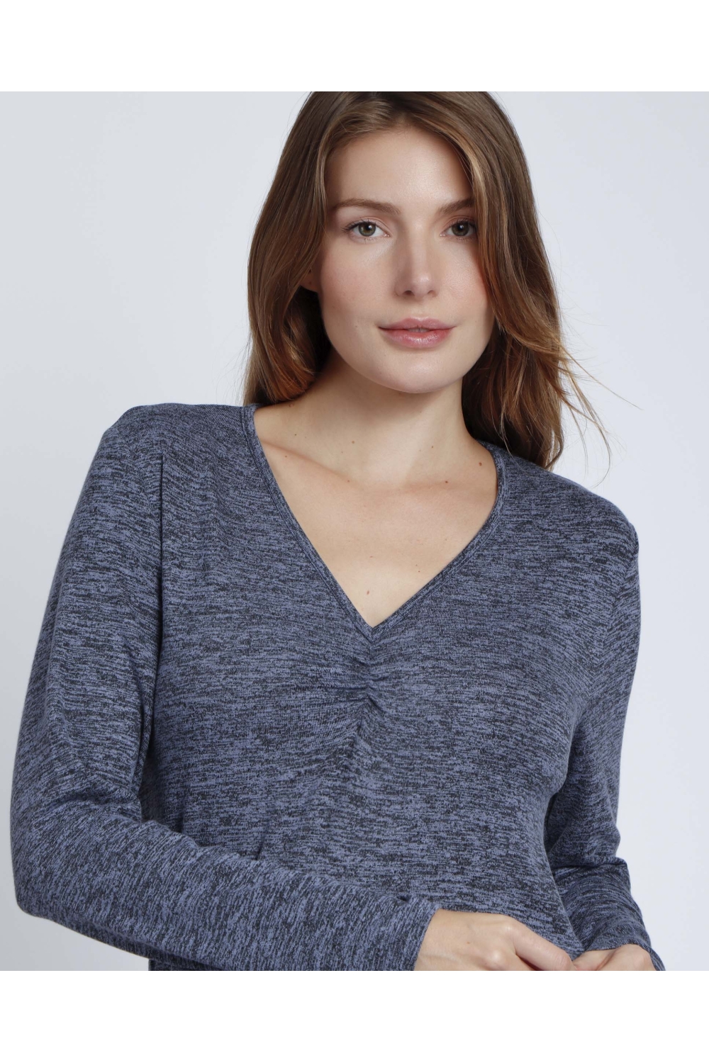 * Camiseta de punto vigoré, de manga larga, con cuello pico con nudo, en tres combinaciones de color: azul jaspe, verde jaspe y gris jaspe.