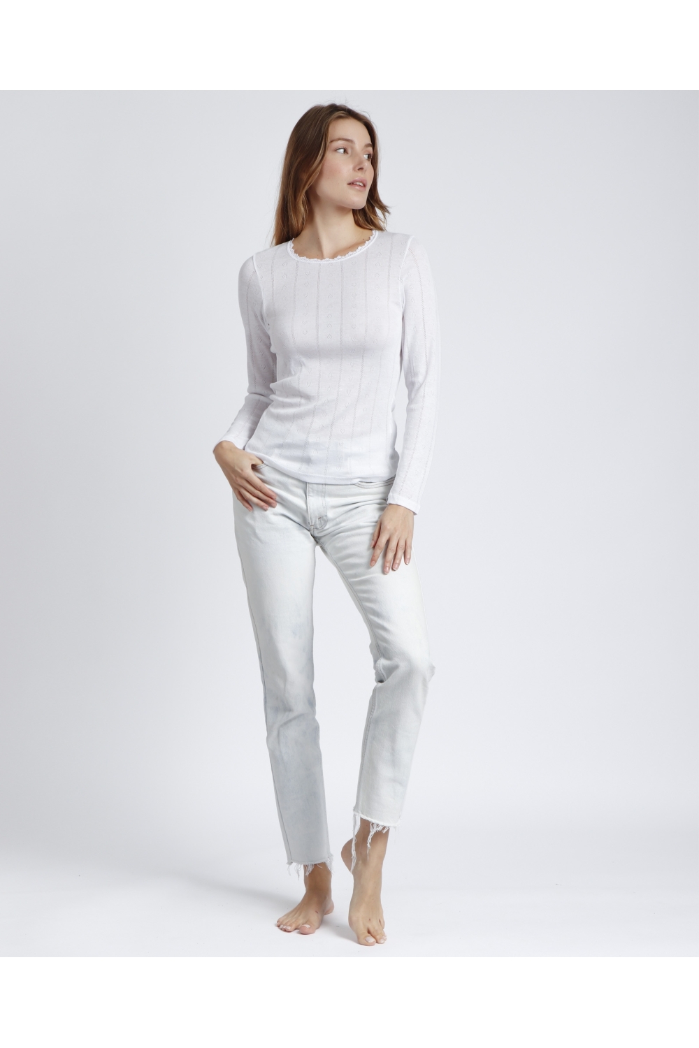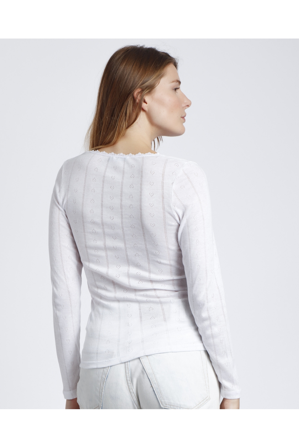 * Camiseta canalé, de punto, de manga larga y con escote redondo con detalles de puntilla lencera.