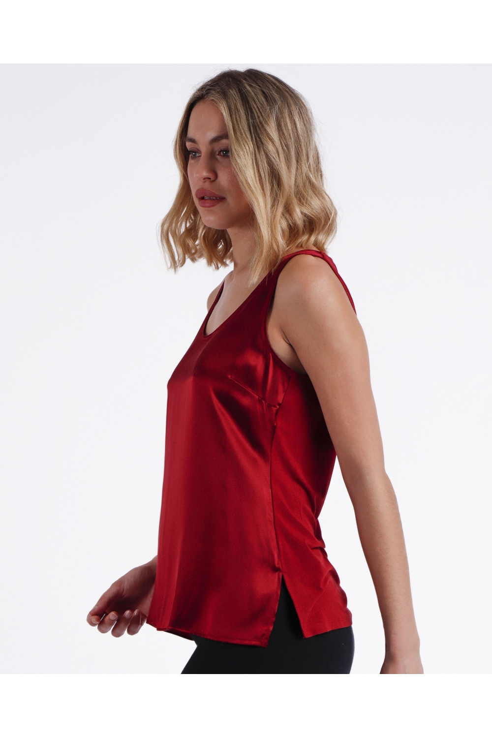 * Camiseta de tela de raso, sin mangas con escote redondo.