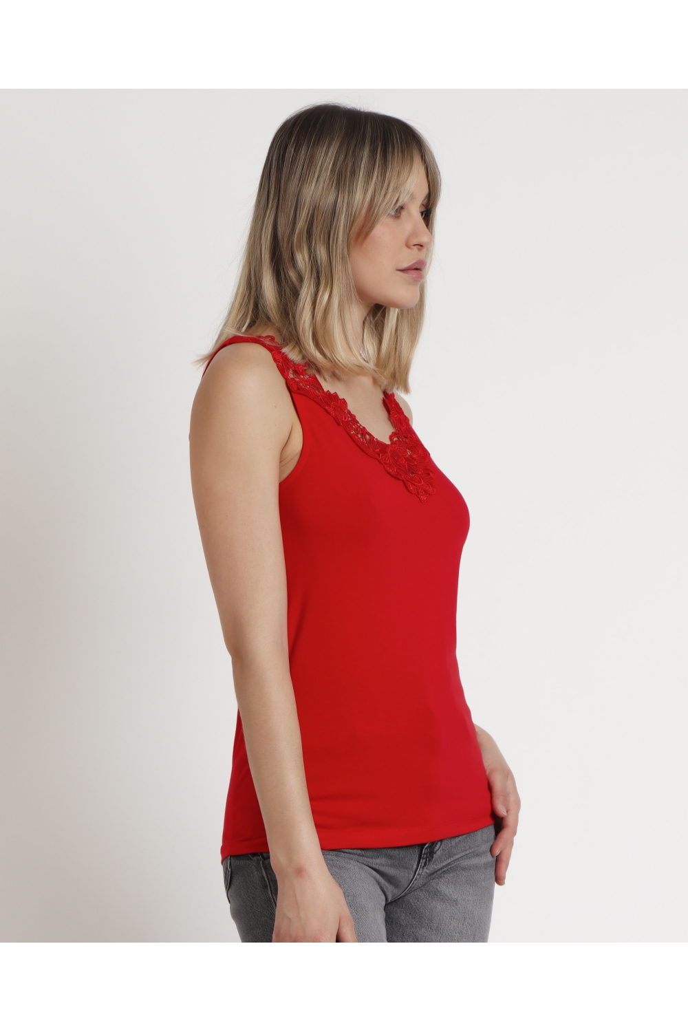 * Camiseta de punto de algodón, sin mangas y con escote con detalles de puntilla de guipur.