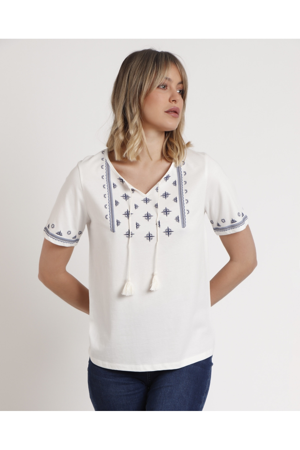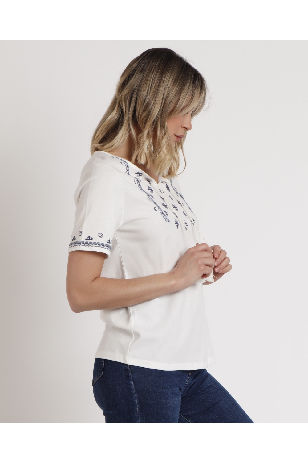 * Camiseta de punto de algodón, de manga corta, con detalles de pompones en el cuello, de color blanco.