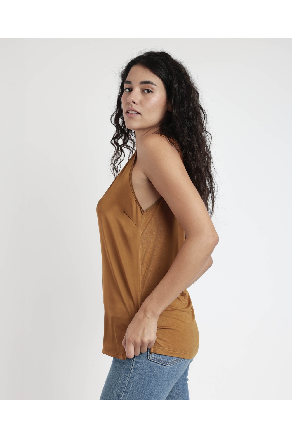 * Camiseta sin mangas y escote pico, en dos combinaciones de color: perla y cobre.