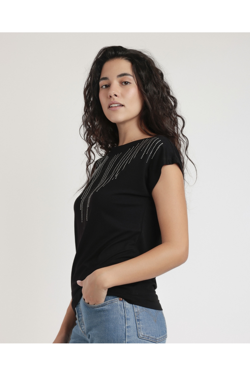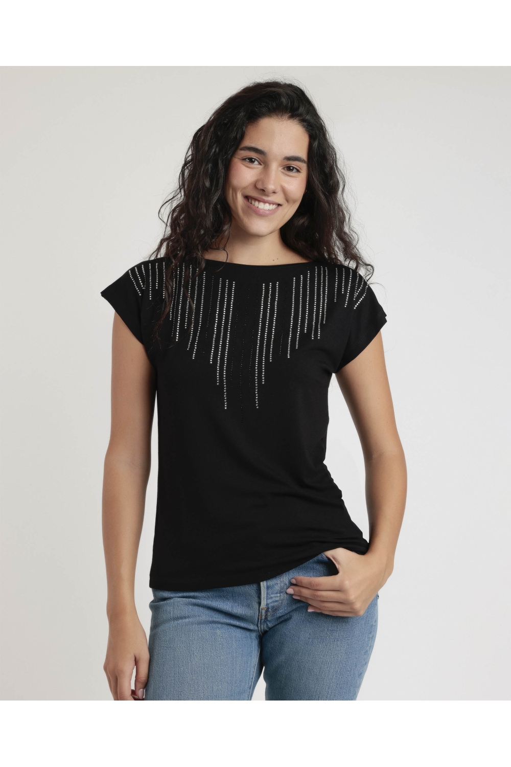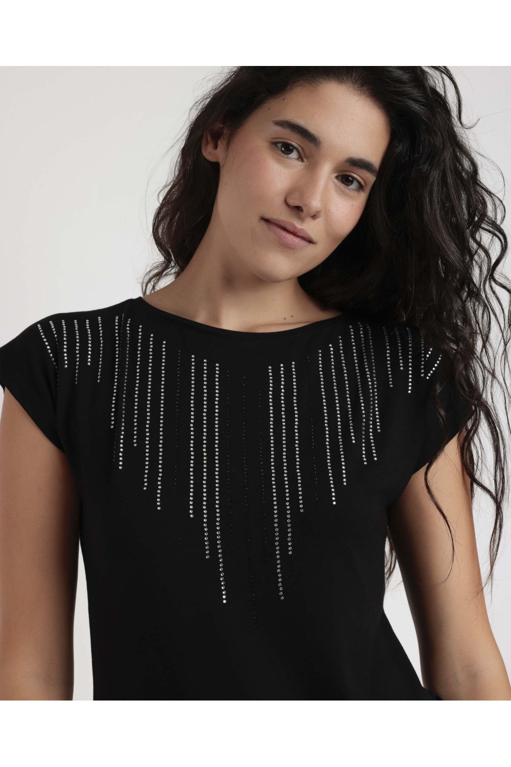 * Camiseta de manga corta para mujer, de cuello redondo, con detalles brillantes, disponible en dos combinaciones de color: negro y crudo.