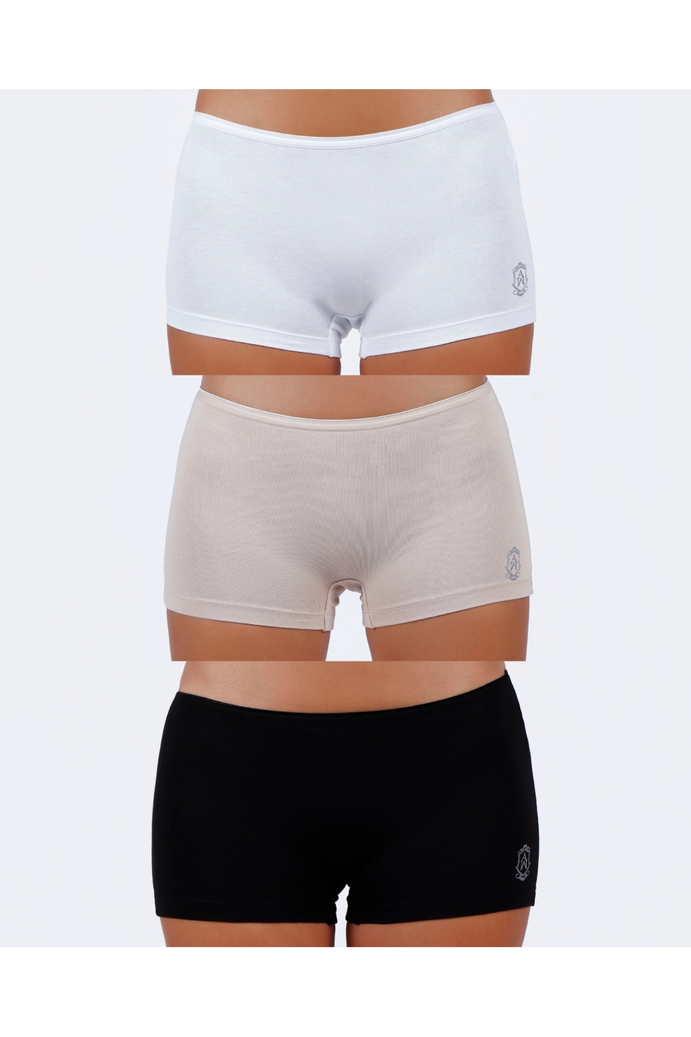 * Culotte para mujer de algodón elástico en tres combinaciones de color: negro, blanco y piel.