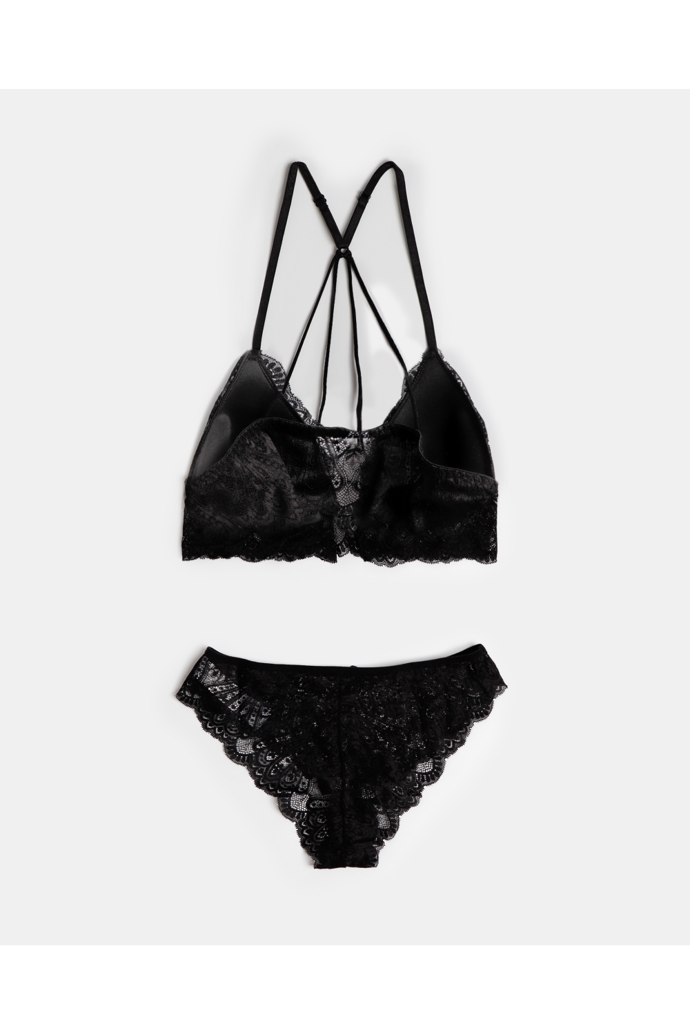 * Conjunto para mujer que incluye un top triángulo con copa y una braguita de encaje, disponible en dos combinaciones de color: rojo y negro.