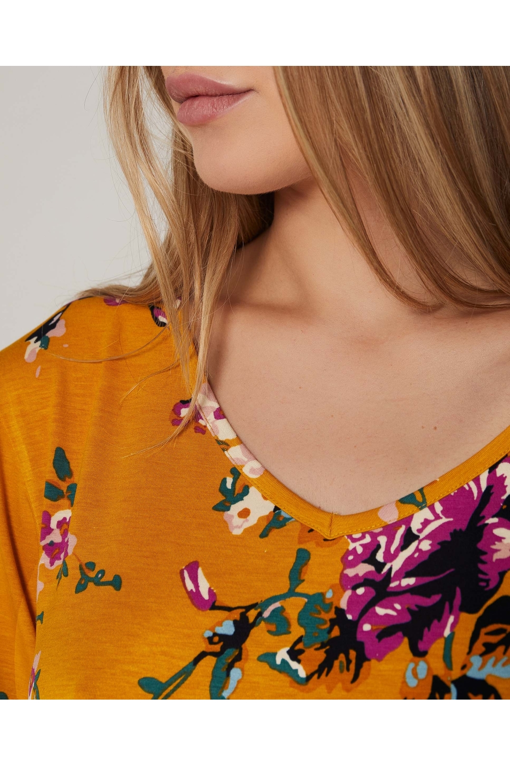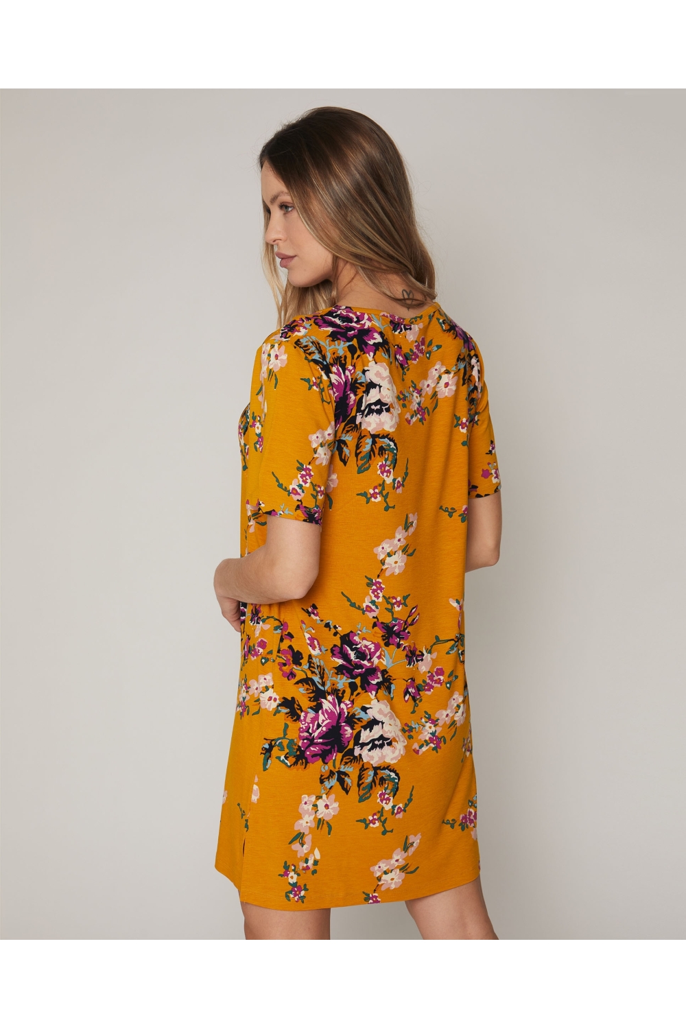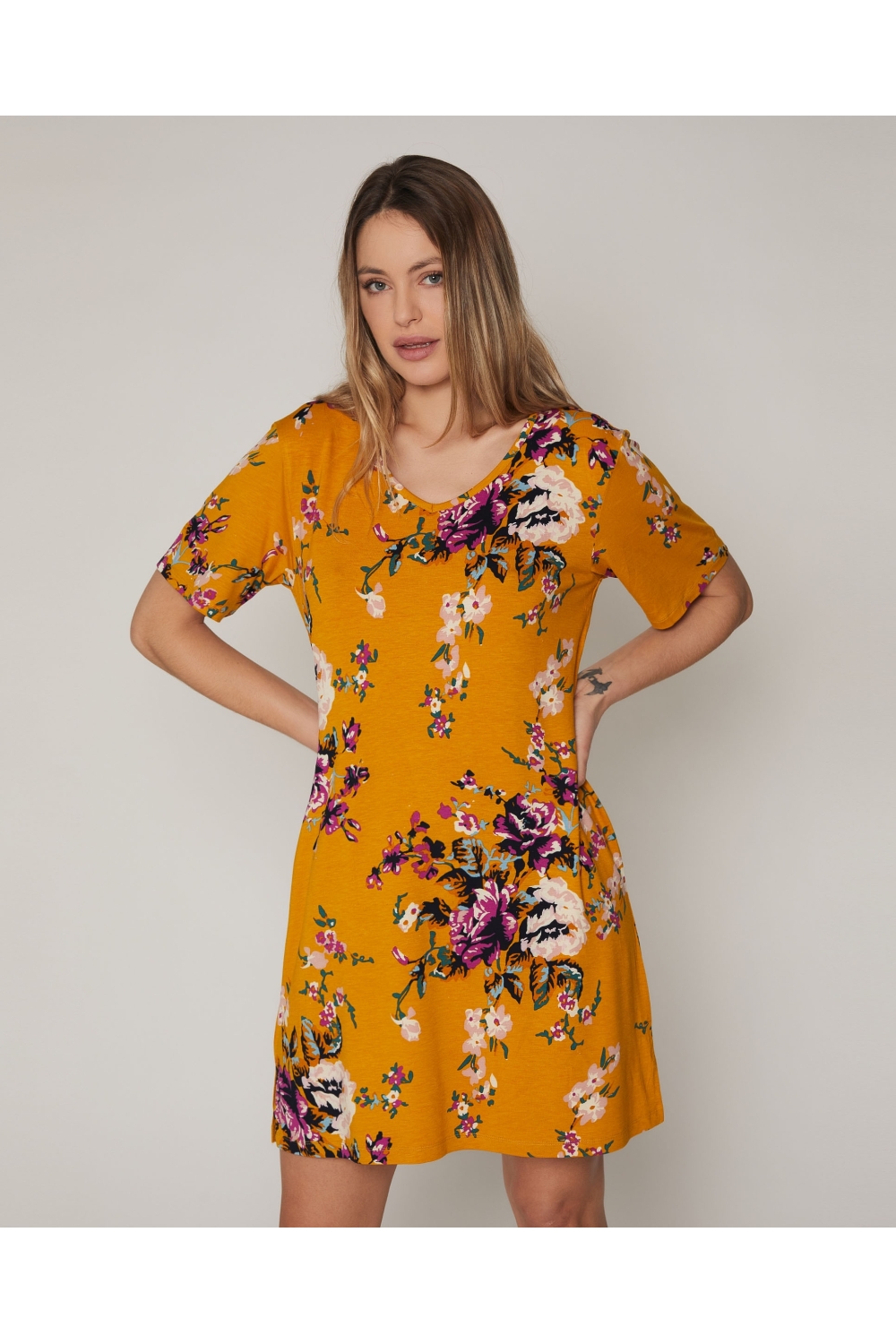 * Vestido de manga corta para mujer de punto viscosa estampado de flores sobre fondo mostaza