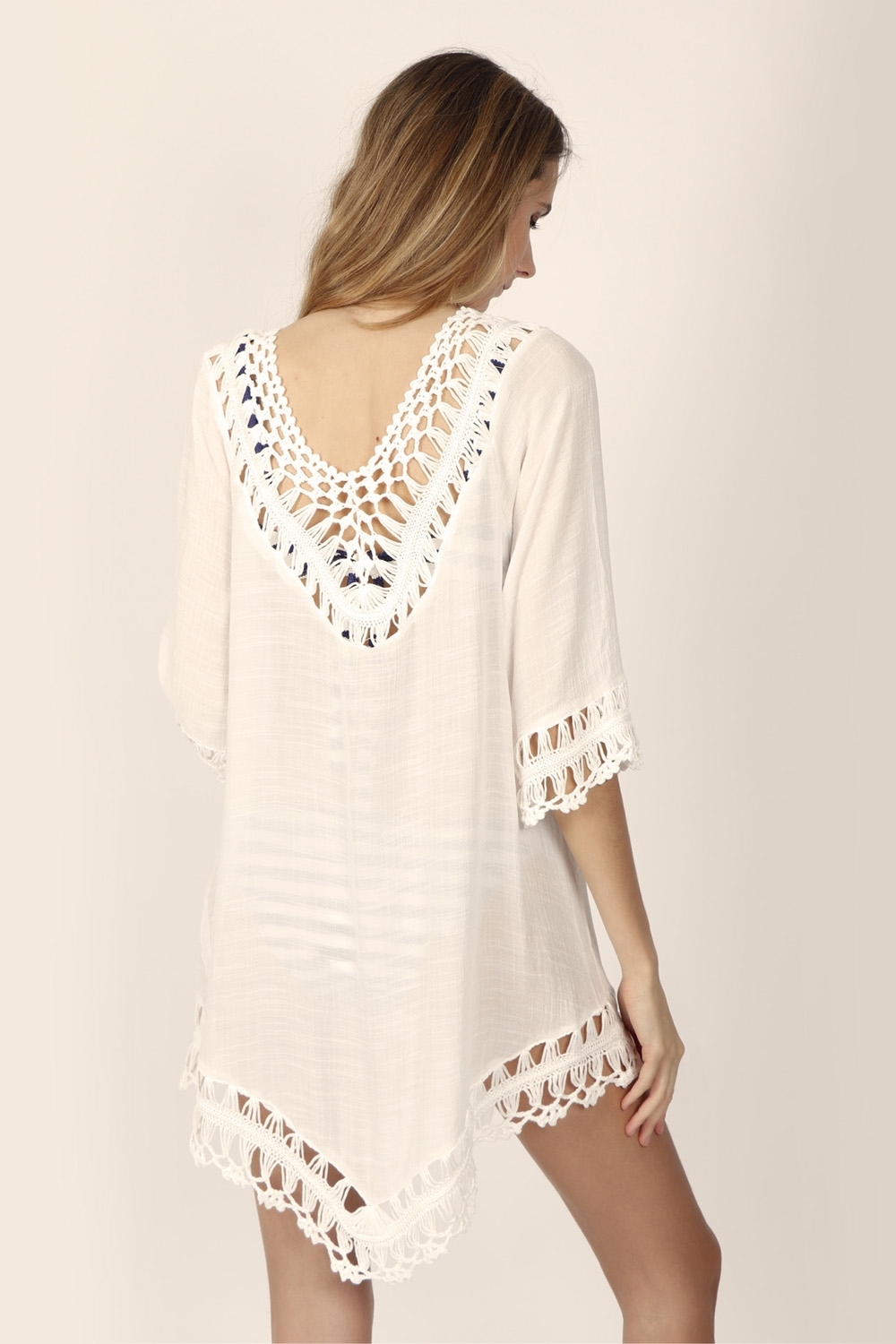 * Vestido de playa para mujer con acabados tipo crochet en la zona del escote y en las mangas, lo que le da un aire artesano a la prenda.