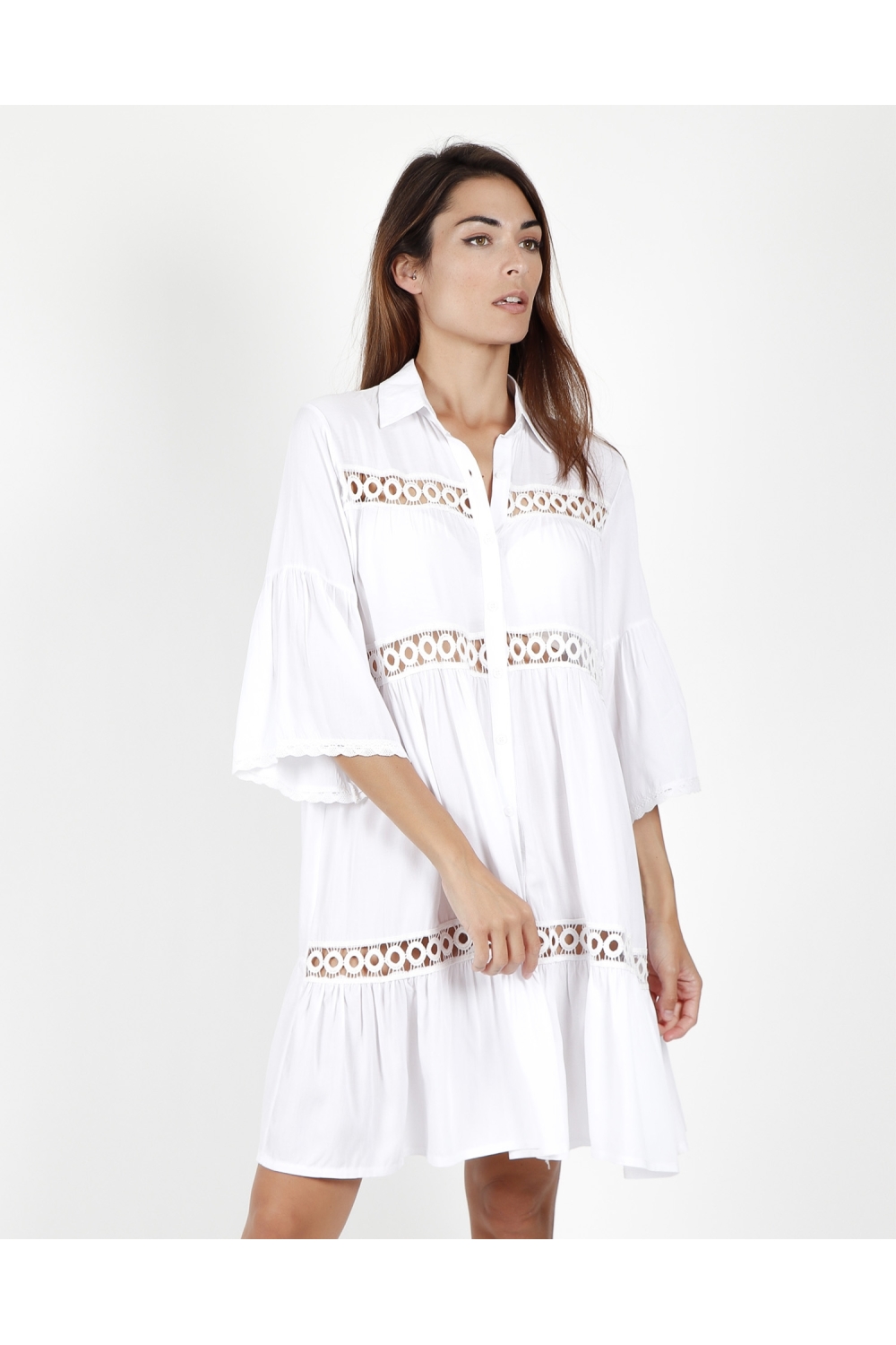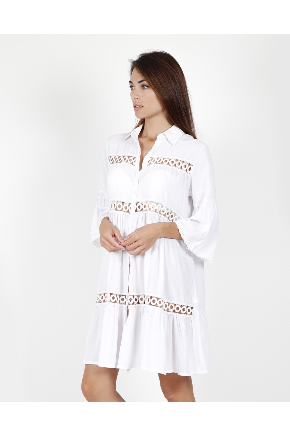* Vestido camisero para mujer de tela de algodón, con detalles bordados, en dos combinaciones de color: marino y blanco.