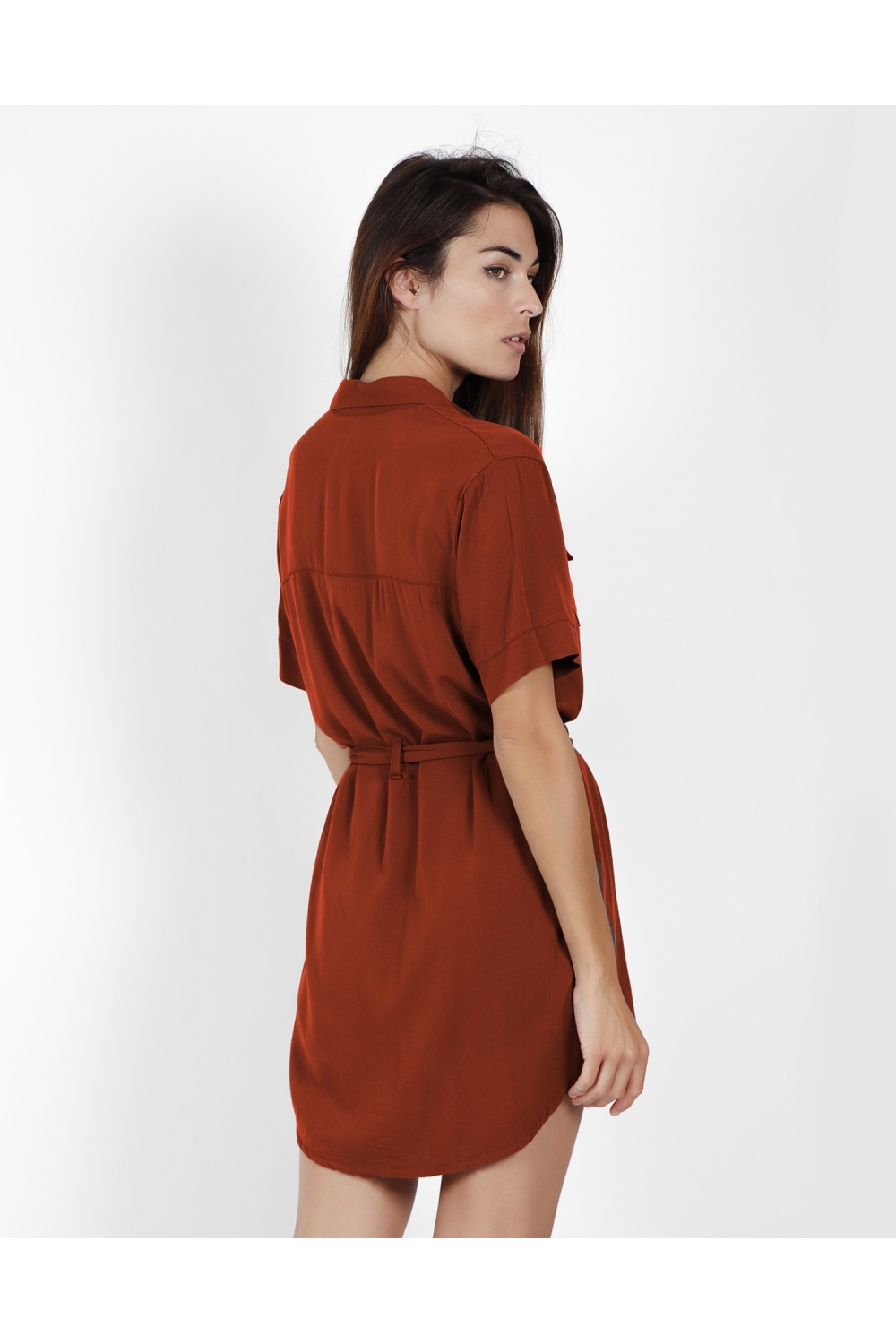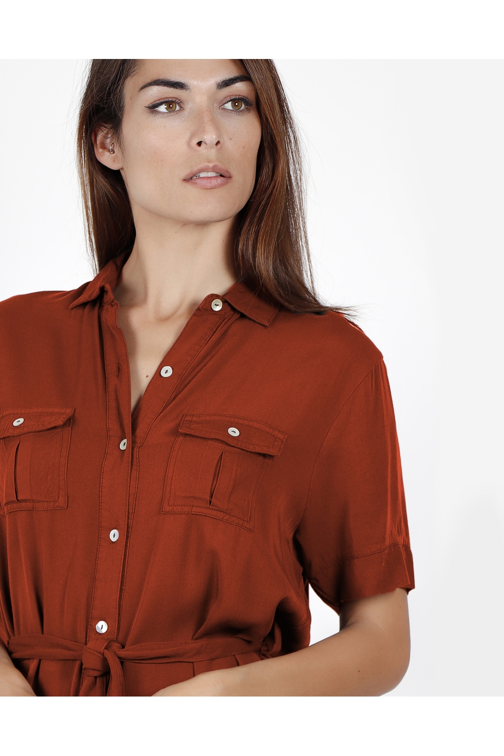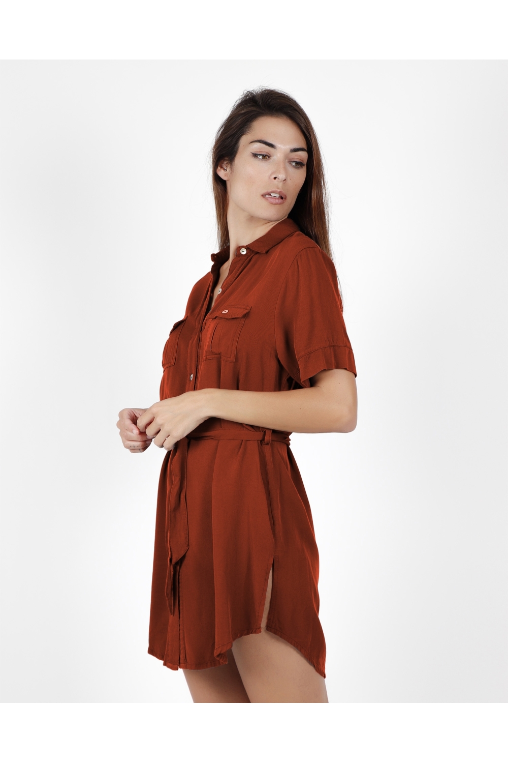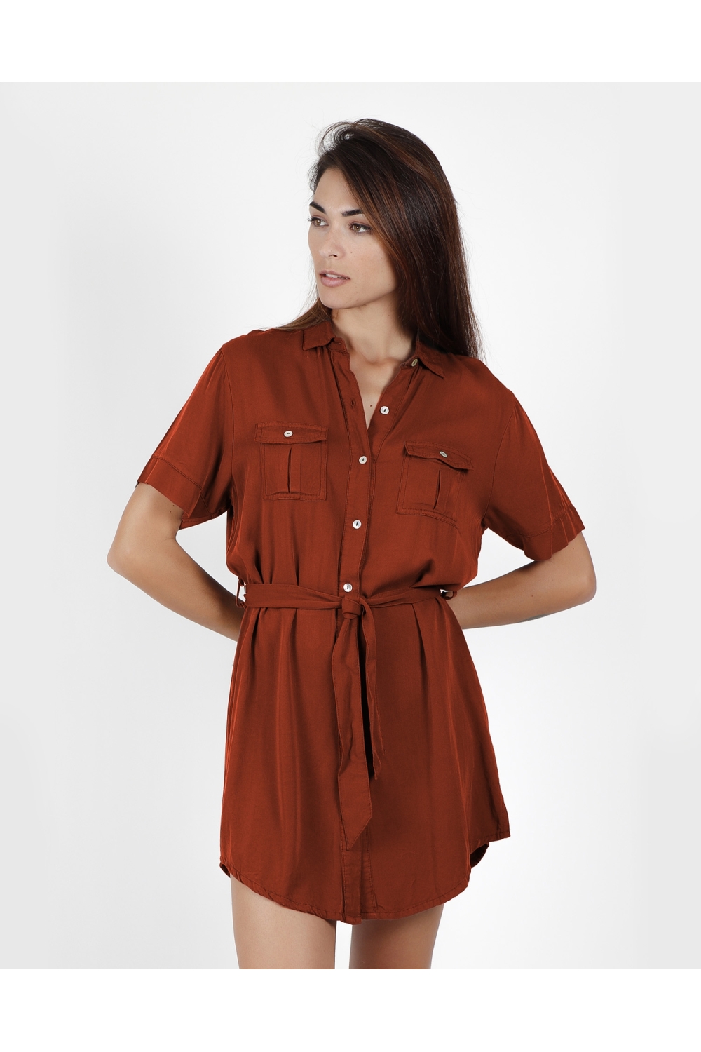 * Vestido camisero para mujer de tela de viscosa, en dos combinaciones de color: teja y caqui