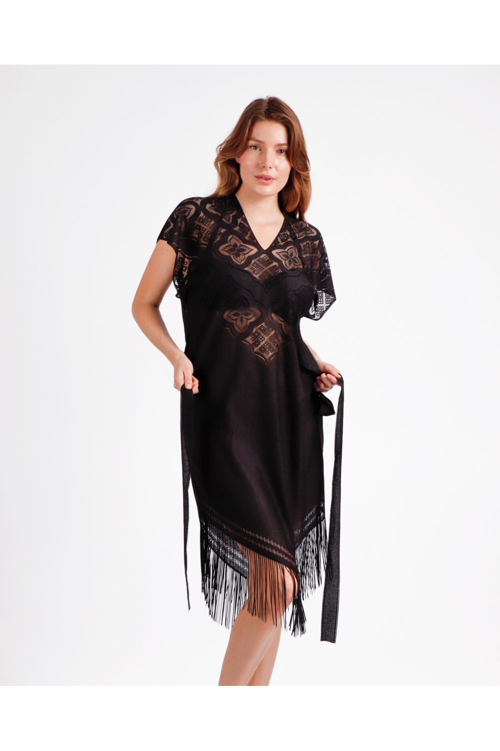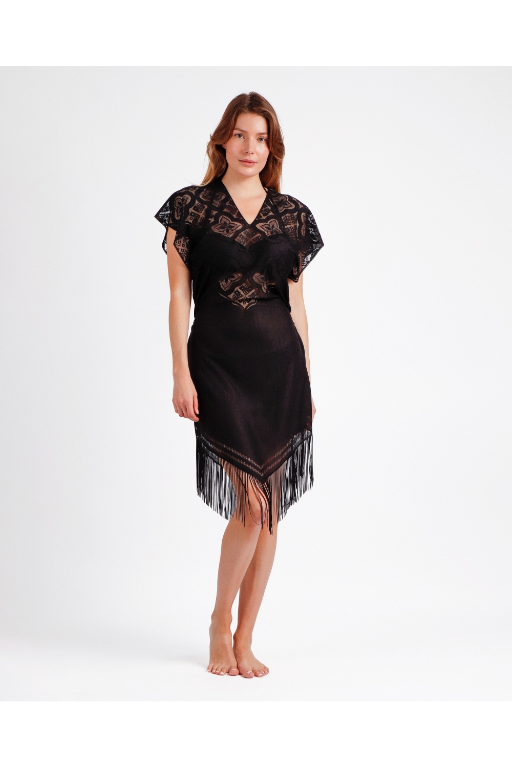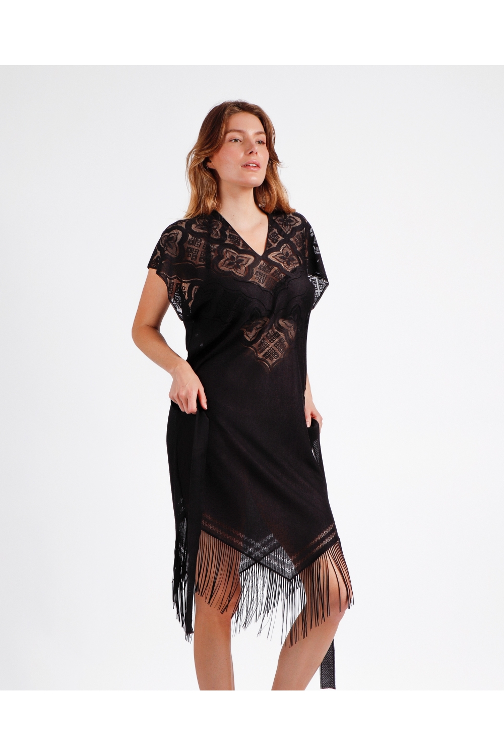 * Vestido de playa para mujer con detalle de flecos y raso, lo que le da un aire artesano a la prenda.