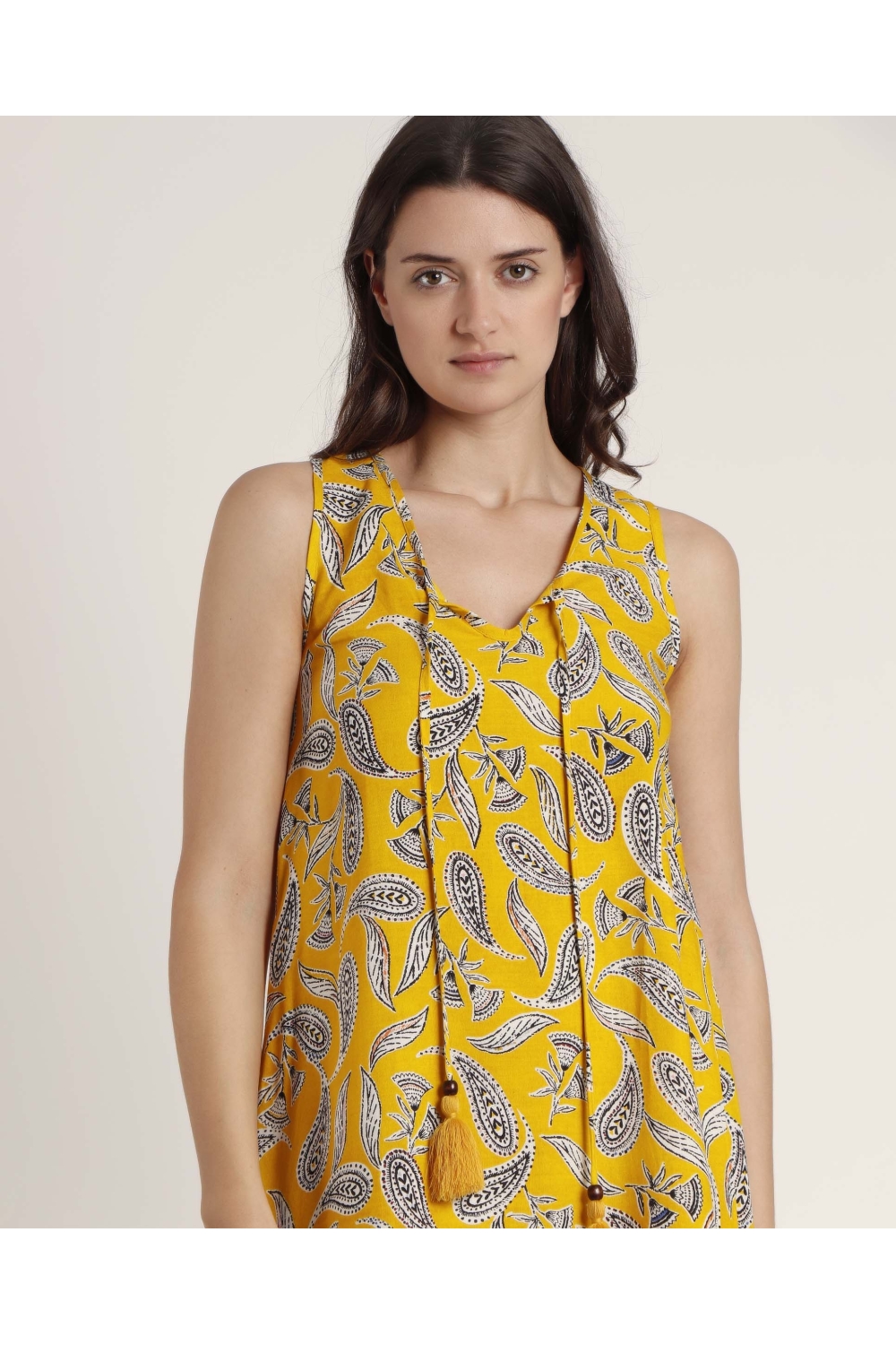 * Vestido para mujer sin mangas, de tela viscosa y color amarillo, con detalles de pompones.