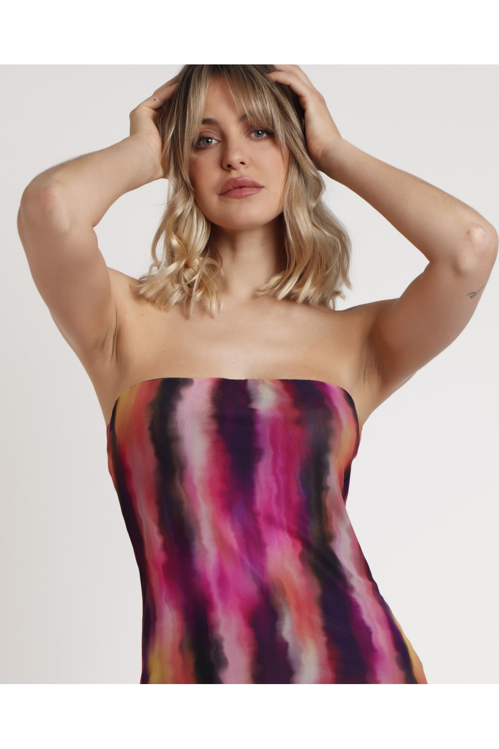 * Vestido corto palabra de honor, para mujer de punto estampado multicolor.